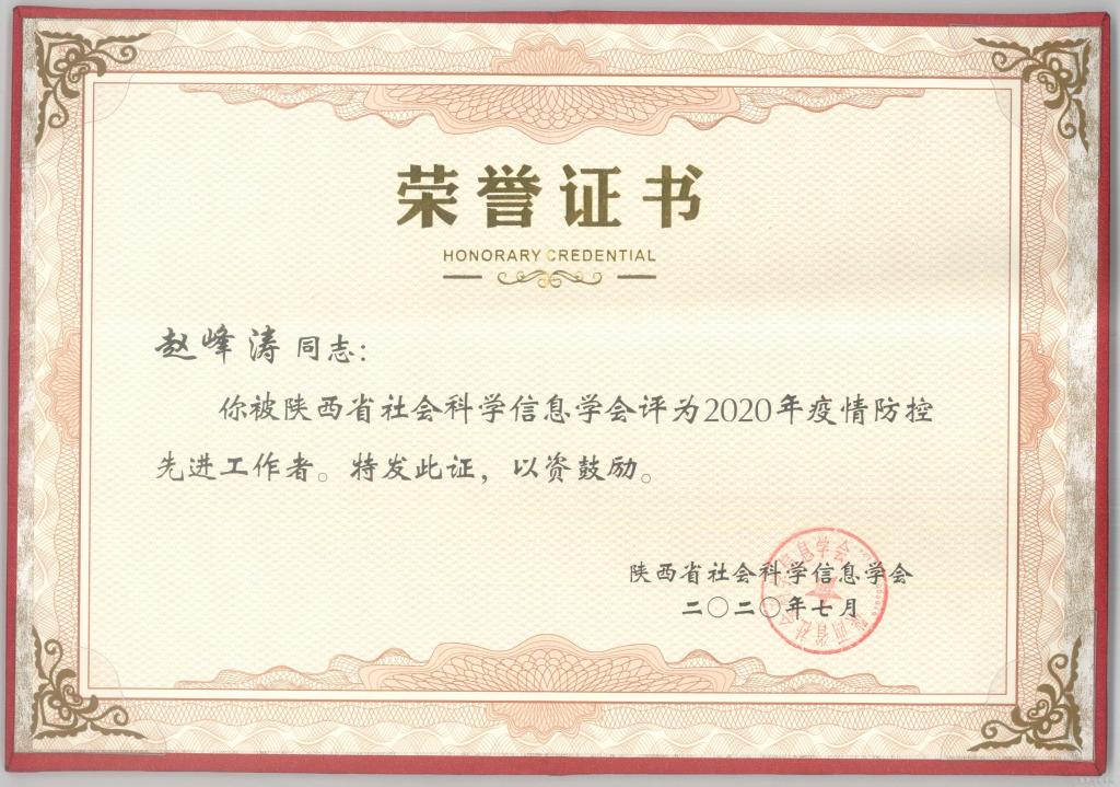 作为陕西省社会科学信息学会的会员单位,我校图书馆在抗击疫情中用心服务、开拓创新,被学会授予2020年疫情防控先进集体荣誉称号;同时,赵峰涛同志被授予2020年疫情防控先进工作者。
