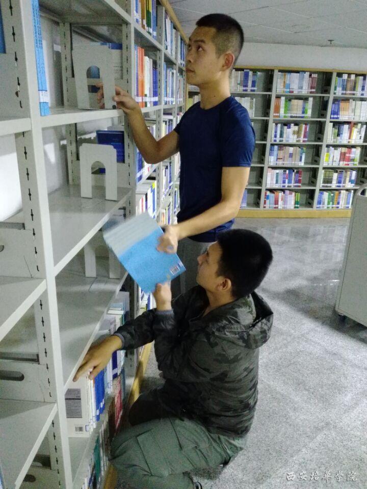 整个下午两位志愿者从图书倒架,分类、整理并进行有规律的排序,每个动作无不渗透一股军人的气息。干中学,学中干,两人很快掌握了倒架技巧及图书排序方法,看着一排排整齐有序的书架,俩个人会心地笑了。