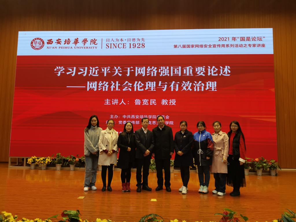 10月27日下午,中共西安培华学院委员会主办、马克思主义学院、党委宣传部承办2021年“国是论坛”第八届国家网络安全宣传周系列活动之专家讲座,邀请西安理工大学鲁宽民教授在西安培华学院图书馆报告厅举行《学习习近平关于网络强国重要论述——网络社会伦理与有效治理》讲座。讲座由校党委宣传部柳雨部长主持,马克思主义学院院长、培华学院党委宣传部及各相关二级学院负责人、骨干教师等100余人参加了会议。