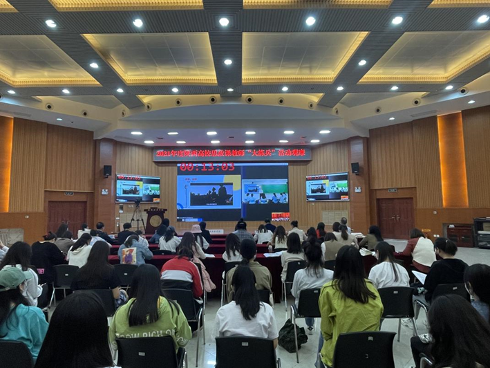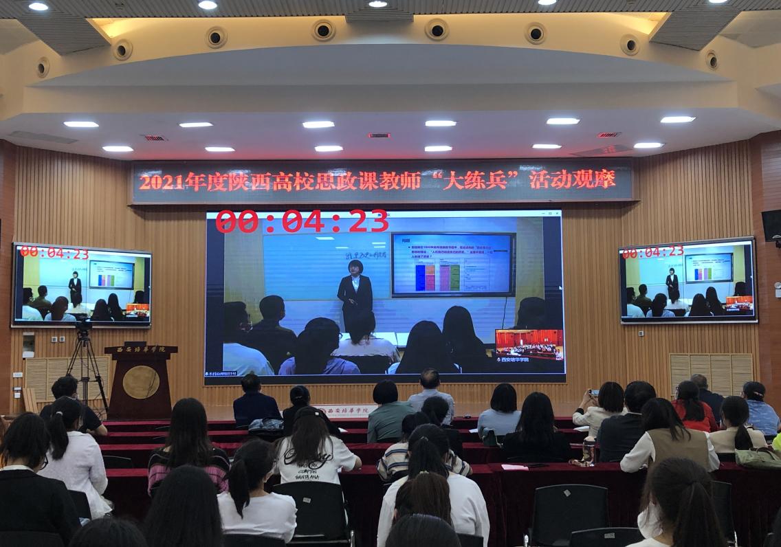 4月26日,由陕西省委教育工委、陕西省教育厅主办的2021年度陕西高校思政课教师“大练兵”省级展示活动在陕西师范大学举行。根据疫情防控要求,此次展示活动采取网络直播方式向全省高校同步播放展示实况。我校校领导、相关部门负责人、全体思政课教师、部分专业课教师以及学生代表在明德楼报告厅全程观摩,共享“云端”思政盛宴。