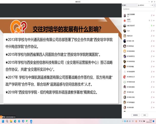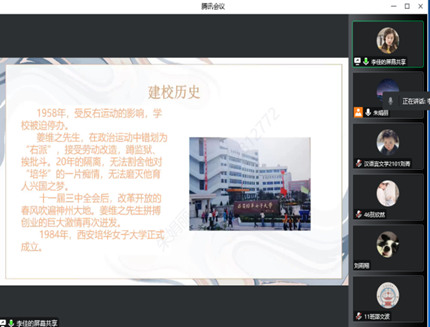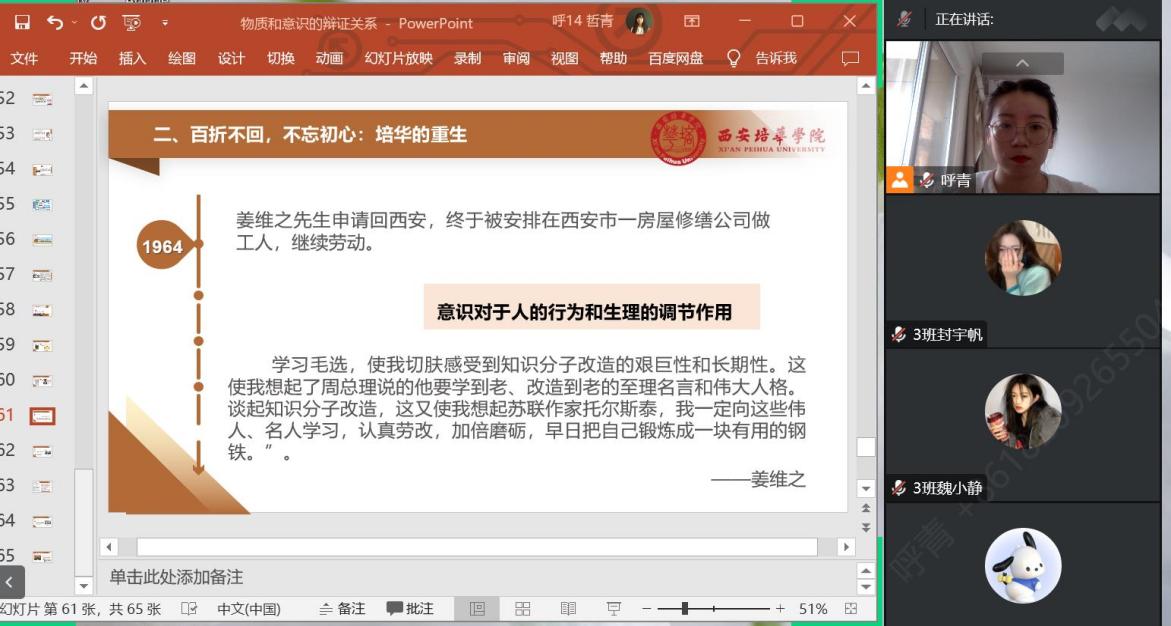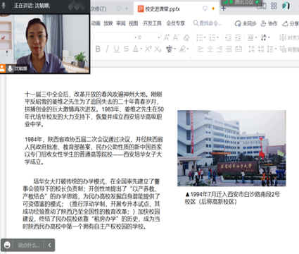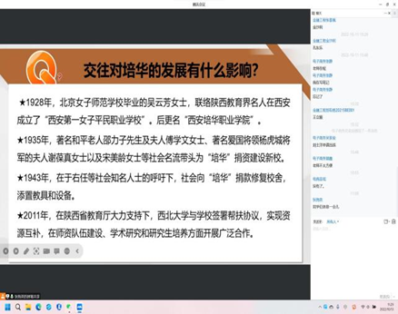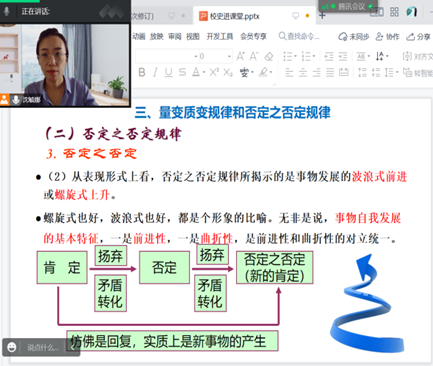 沈毓娜老师通过云班课讨论的方式在讲述“否定之否定规律”时融入了校史内容。通过带领学生们梳理西安培华学院的历史发展过程,让学生们深刻理解学校办学历史的艰辛。同学们表示西安培华学院的发展就是一个不断自我发展、自我完善的过程,是波浪式前进和螺旋式上升的,是曲折性和前进性的统一。在未来的人生道路中我们也应发扬培华人艰苦奋斗、不怕困难的精神。