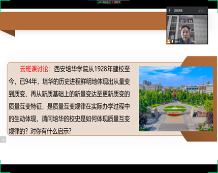 黄蓉老师以云班课讨论的形式在“量变质变规律”内容的讲授中融入了培华校史。通过给学生讲述培华发展经历的四个阶段和办学过程中面临的挫折和困难,帮助学生更好的理解质量互变规律的同时,增强学生的爱校荣校情怀。