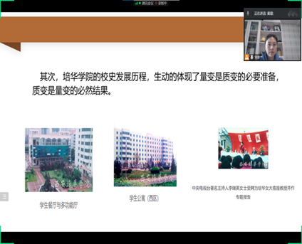 呼哲青老师以”筚路蓝缕 不忘初心——回望姜维之的建校历程”为主题,从“投身教育,颠沛流离:中断25年的血脉”、“百折不回,不忘初心:培华的重生”、“以产养教,产教结合:塑造培华模式”三个篇章展开姜维之先生历经磨难,但仍不屈不挠,用一种钢铁般的意志,书写培华壮丽篇章的校史,结合意识的能动作用开展校史进课堂,让同学们深切地感受到姜维之精神,将培华“以人为本、以德为先”的办学理念描绘在办学史上。
