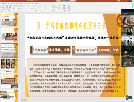 陈欢老师以讲述“矛盾的普遍性和特殊性关系”为核心融入了校史内容,让同学明白矛盾的普遍性和特殊性辩证关系的原理是马克思主义基本原理同民办高校办学、治学实际相结合的哲学基础。西安培华学院这所西部首家民办本科高校就是坚持把马克思主义基本原理同本校学情相结合,同西安这座城市和陕西民办教育实际相结合,在推进民办教育朝着办学理念先进、质量不断提高、设施齐全、学科完整的百年民校不断取得新的成绩。