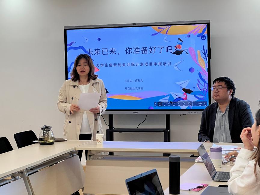 2023年4月13日,马克思主义学院“未来已来,你准备好了吗?——大学生创新创业训练计划项目申报培训”在2501-B会议室举行。会议由马克思主义学院教学副院长霍艾湘教授主持,培训由马克思主义学院薛舒凡老师主讲。
