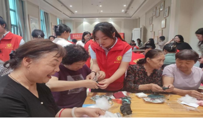 学生志愿者指导居民制作端午香囊和挂饰