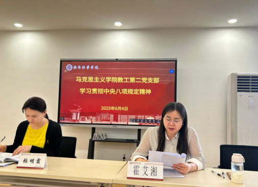 为深入贯彻落实全面从严治党要求,进一步加强作风建设,马克思主义学院教工第二党支部于2025年6月4日在2501B会议室开展中央八项规定精神专题学习会,会议由党支部书记张明霞主持,马克思主义学院副院长霍艾湘领学,支部全体党员教师参加。