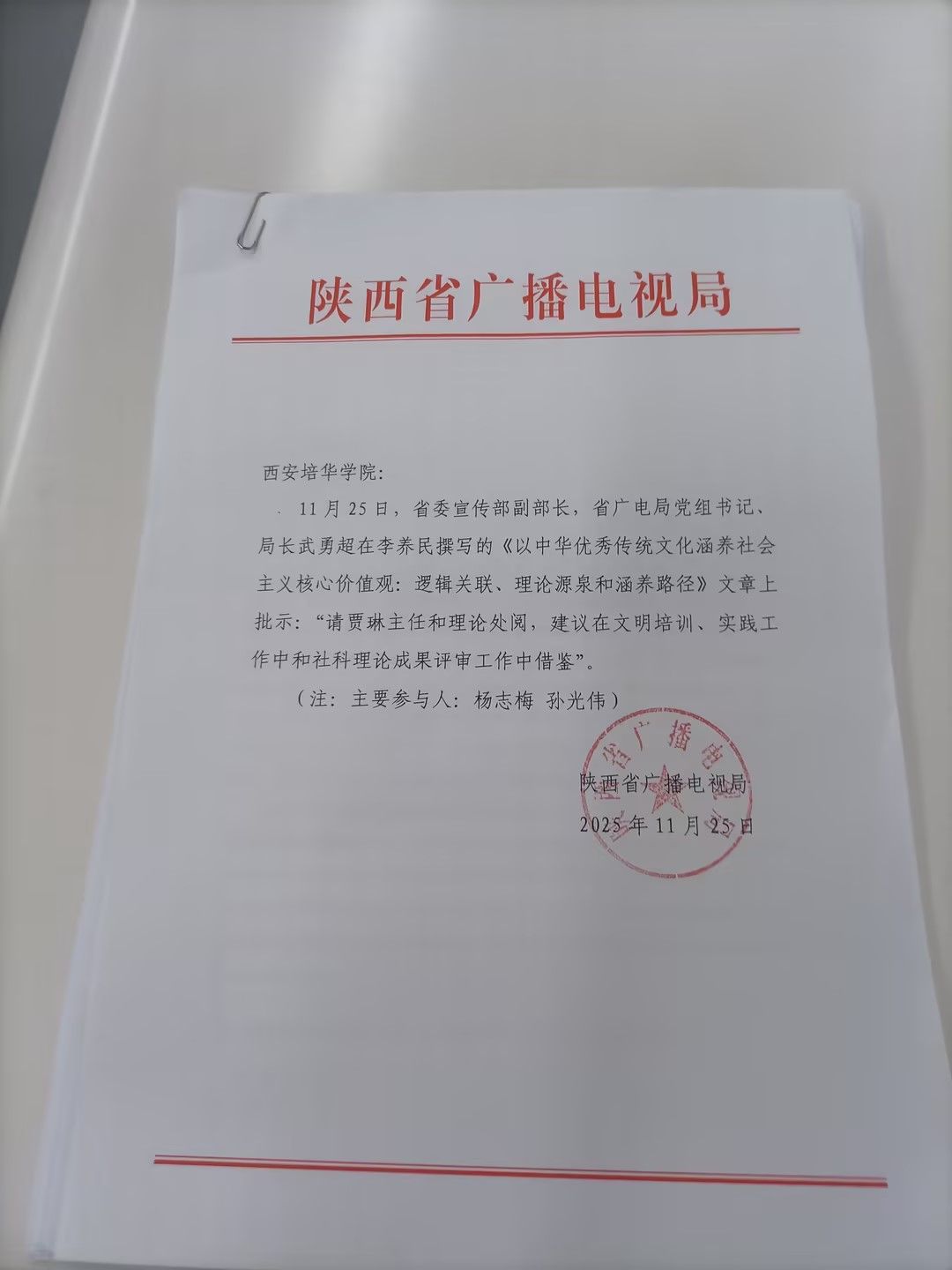 2025 年 11 月 25 日,省委宣传部副部长,省广电局党组书记、局长武勇超在李养民团队撰写的理论文章《以中华优秀传统文化涵养社会主义核心价值观:逻辑关联、理论源泉和涵养路径》上作出重要批示并建议在文明培训、实践工作中和社科理论成果评审工作中借鉴,为全省广电系统深化宣传思想文化工作、推动核心价值观落地提供了明确指引。