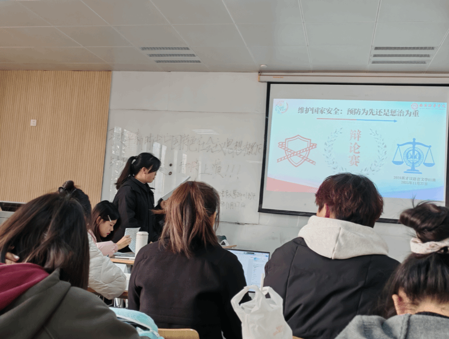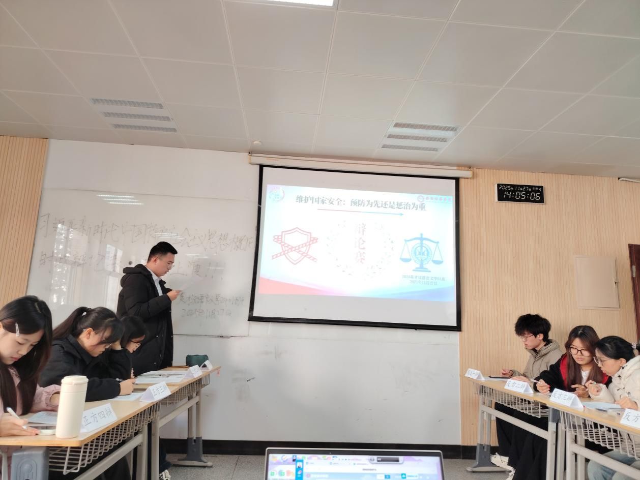 2025年11月27日,马克思主义学院杨志梅老师组织的“维护国家安全是预防为先还是惩治为重”主题辩论赛在育英楼3304教室精彩上演。汉语言文学2401英才班学子们以辩为媒、以思为刃,围绕核心议题展开激烈交锋,在思想碰撞中深化对总体国家安全观的理解与认知。