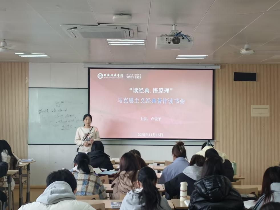 2025年11月16日,毕静烨子老师与卢俊平老师结合课程内容,为学生选取了兼具思想深度与可读性的马列著作篇目,引导学生逐字逐句研读原文,帮助学生理解著作中蕴含的哲学原理、辩证思维与实践智慧,同时结合当下的时代发展与社会现实,解读经典理论的当代价值,让学生感受到马列著作并非脱离现实的理论文本,而是可以指导现实思考的思想工具。
