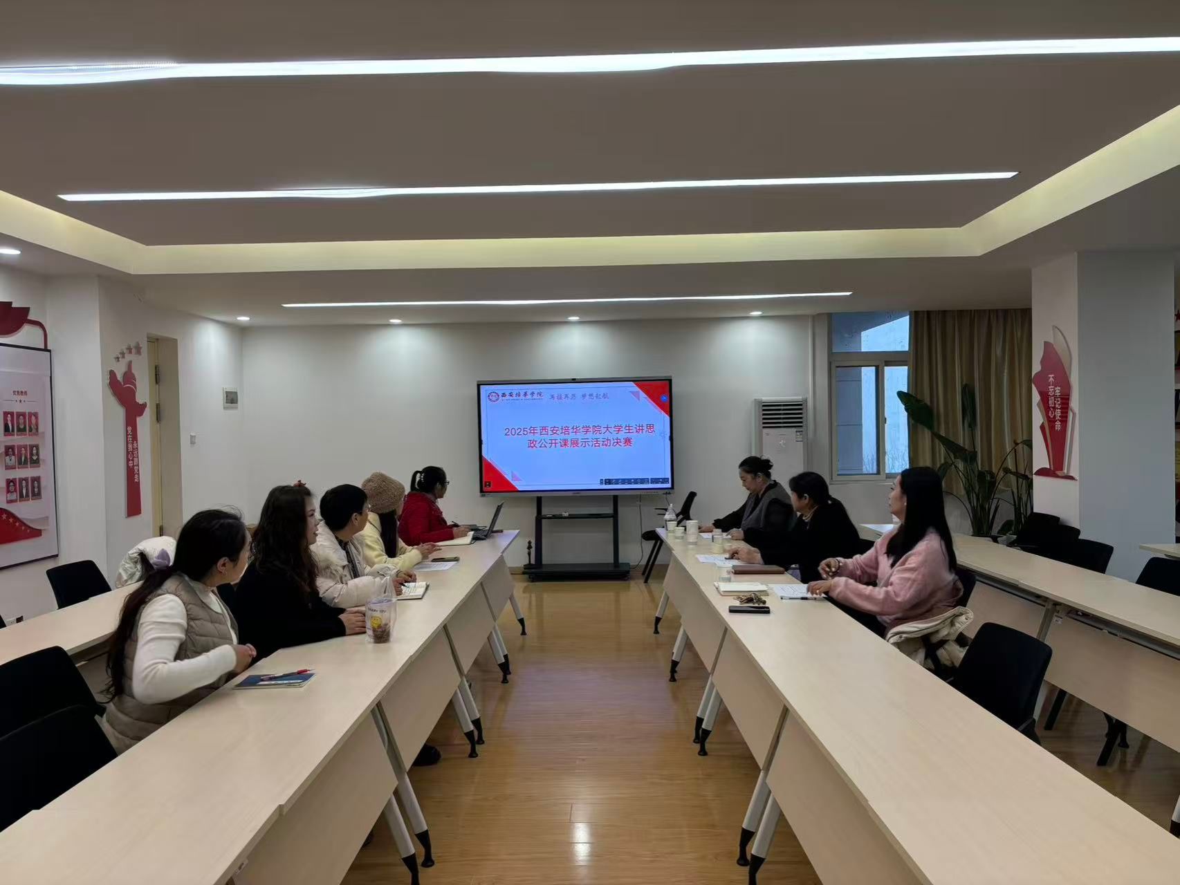 在新中国成立 76 周年的时代背景下,为持续深入贯彻落实习近平总书记在学校思政课教师座谈会上的重要讲话精神,全面推进习近平新时代中国特色社会主义思想进教材、进课堂、进学生头脑,切实将思政教育融入学生成长全过程,西安培华学院于 2025 年 12 月 31 日在博远楼 2501-B 会议室成功举办 2025 年大学生讲思政公开课决赛。本次大赛特邀马克思主义学院副院长霍艾湘教授、《毛泽东思想和中国特色社会主义理论体系概论》教研室主任袁娜副教授、《马克思主义基本原理》教研室主任李雯副教授担任评委,三位评委凭借深厚的理论功底与丰富的教学经验,为大赛提供专业、严谨的评审指导。