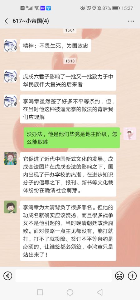 同学们,很高兴成为你们青春同路人!你每一次的学习参与,都是你学习能力的提升。你们在直播课堂的每一次语音文字发言、每一次小组讨论、云班课的每一次学习和思考,每一点学习都会记录下你的收获!老师我会用心的记录下每一堂课每一个同学的学习提升,细致的记录下你们的成长:话说历史、小组讨论截图、小组代表发言、文字发言、网卡学生课后沟通记录......