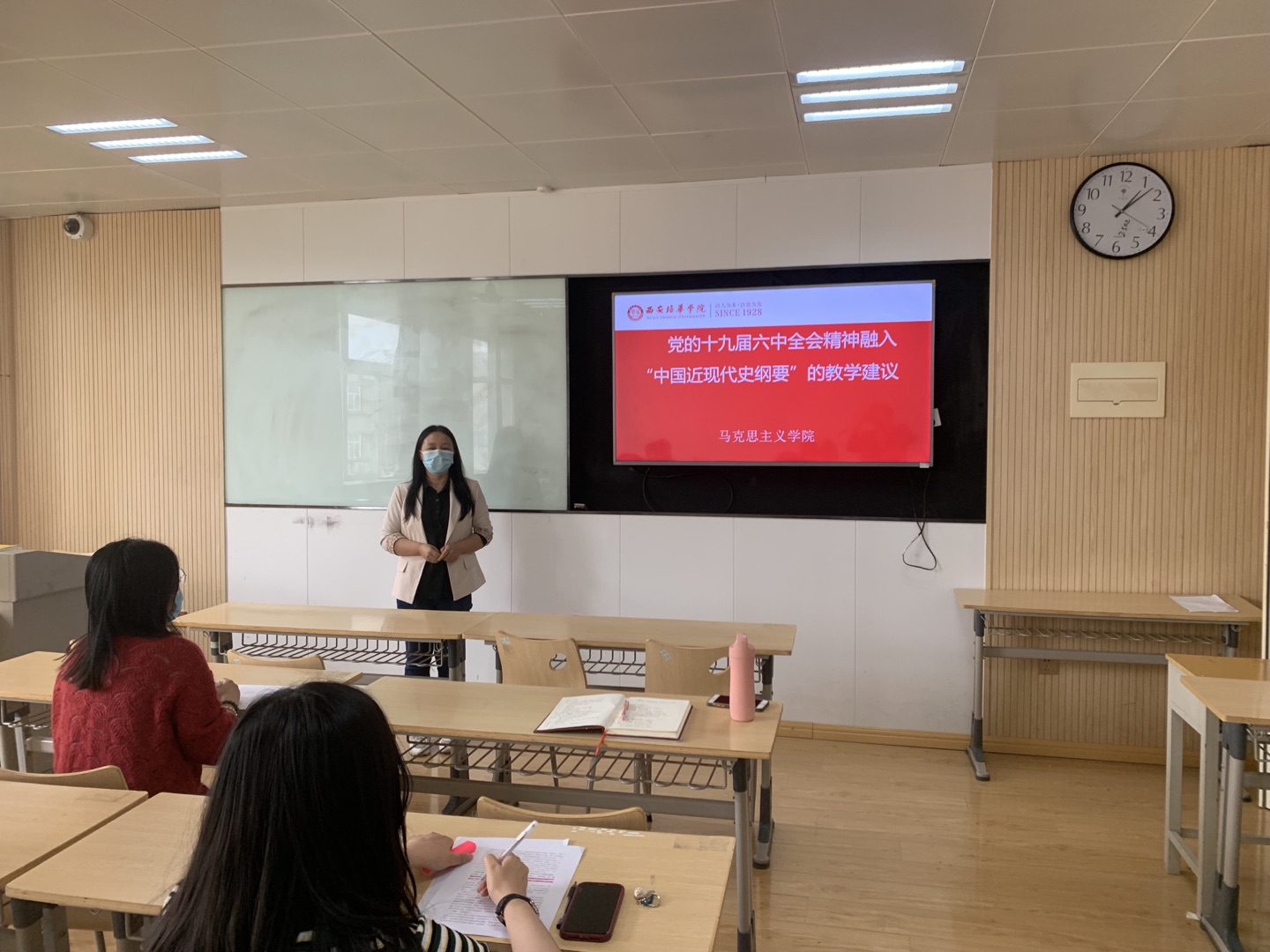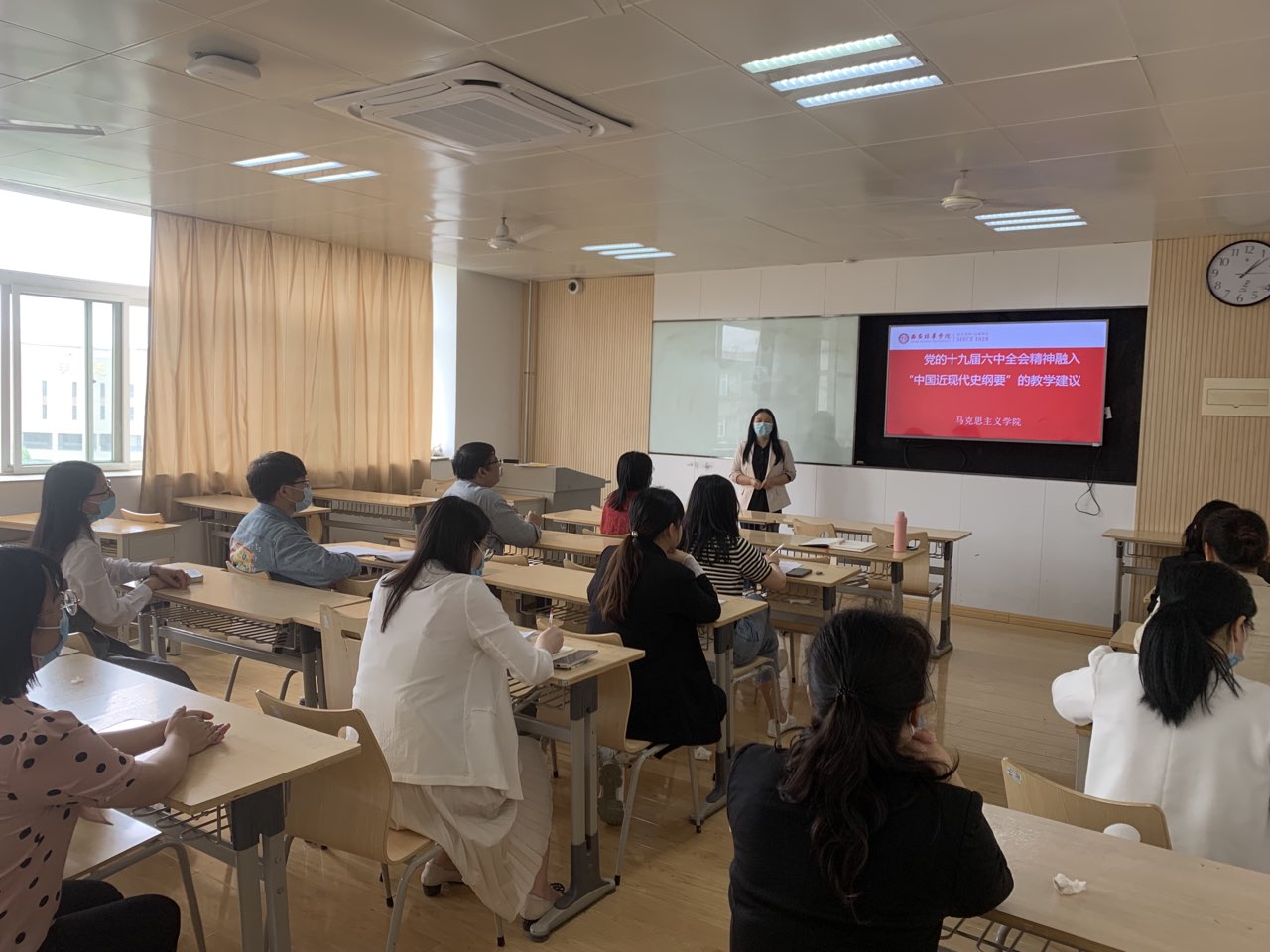 会上,樊老师组织各位老师认真学习了教育部高校思政课教学指导委员会关于党的十九届六中全会精神融入”中国近现代史纲要”课的教学建议。