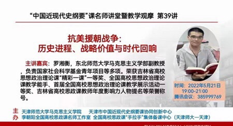 为了进一步提升《中国近现代史纲要》课程教学质量和教学水平,近期马克思主义学院《中国近现代史纲要》教研室全体教师在樊静主任的带领下,通过网络平台参加了第38期、39期“中国近现代史纲要”课名师讲堂暨教学观摩课的学习,同时教研室根据两次线上观摩课的主题《中国革命道路是怎样探索和开辟的》、《抗美援朝战争:历史进程、战略价值与时代回响》进行了云端集体备课。