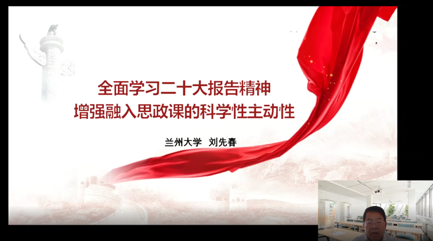 第一场培训主题为《全面学习二十大报告精神,增强融入思政课的科学性、主动性》,本场培训由兰州大学教授刘先春主讲。刘教授分别从党的二十大报告主要内容、最新教材编写情况等方面进行讲解,他勉励各位教师要狠抓基础功,通过仔细研读二十大报告全文及辅助材料,将二十大精神融入课堂教学全过程。