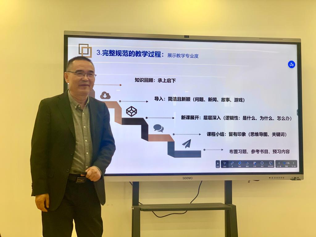 作为学校教学督导,杨教授还梳理了听评课中发现的几个常见问题并针对问题的解决给予了具体建议。着重强调备课对于上好一堂课的重要作用,分享了备课的“七步法”流程:研读分析规则、学习往期视频、确定选题、搜集教学素材进行教学设计、写脚本(讲稿)确定教学内容、制作PPT设计板书、演练反复打磨。