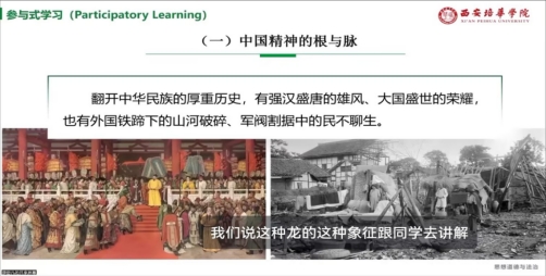 薛舒凡老师以问题导入,引出本节课的主题——中国精神。教学过程中,薛老师突出问题导向,以问题驱动的方式搭建教学框架,激发学生问题意识,坚持以学生为中心的理念,激发学生参与课堂。从中国精神的来源、形成、丰富内涵及影响等方面进行讲解,教学思路清晰,循序渐进,逻辑严谨,有理论阐释、有师生互动,展示出良好的专业素养和教学能力。