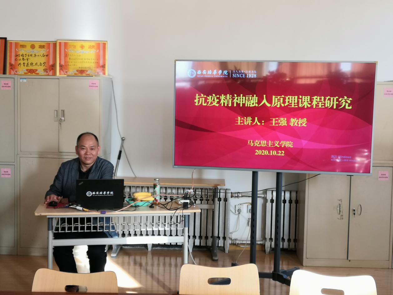2020年10月22日,秋高气爽,久违的太阳也来捧场,在马克思主义学院会议室,西北大学王强教授为全体教师带来一场题为“抗疫精神融入原理课程研究”的精彩报告。