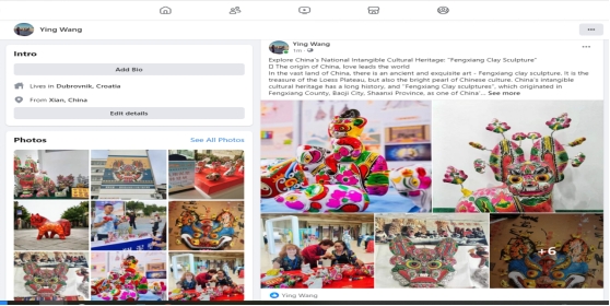 国际推广宣传,非遗韵动世界。7月18日,为了更好地助推非遗泥塑扩大宣传、推广,团队成员建立了遗风继韵工作室官方微信公众号,不定期持续推送关于非遗泥塑的相关信息。同时,团队成员还积极拓展国际宣传,团队成员中广播电视编导和播音与主持艺术专业的学生辅助英语专业的学生在调研泥塑村期间完成了英文国际推广视频的拍摄、剪辑以及Facebook网站的推广等工作,同时将非遗泥塑的图文推广到国外平台以及产品编辑投放到了国外售卖平台ozon上,充分体现了培华学子跨专业融合、积极推广非遗传统文化的使命责任担当。