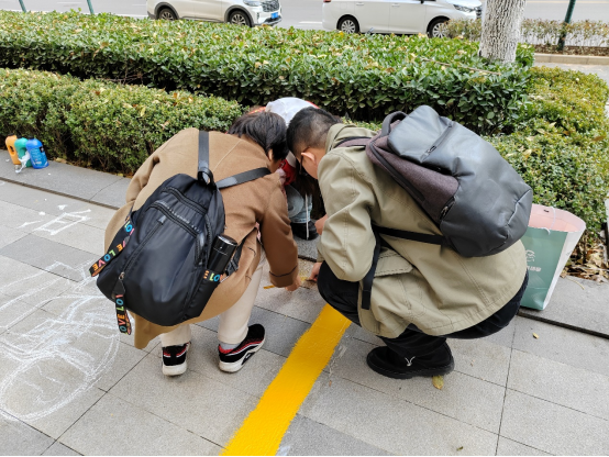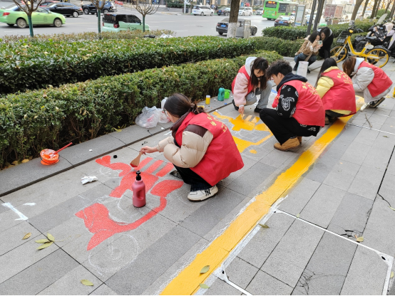 在图案绘画过程中,虽然气温越来越低,蹲着的腿越来越酸,但师生们任劳任怨、毫无怨言,甚至顾不上喝一口水、挺一挺腰,大家一丝不苟地描绘着一幅和谐、友爱、互助的社区蓝图。