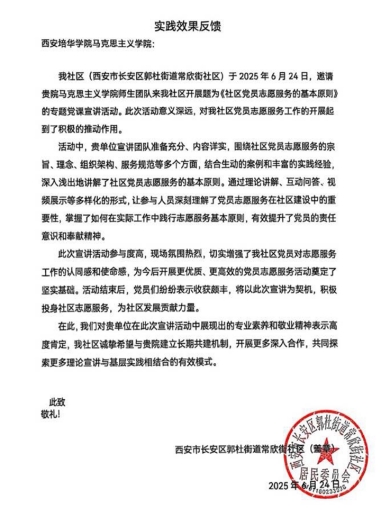 本次活动,受到了社区的高度肯定,学院收到了社区饱含赞誉的反馈信函。此次师生送党课进社区活动,充分发挥了西安培华学院马克思主义学院师生的专业优势,不仅丰富了基层党员的学习内容,为社区和农村党员队伍建设注入新活力,也为师生搭建了理论联系实际的实践平台。未来,校社各方将持续深化合作,以更优质的党课内容、更丰富的活动形式,为基层党建工作贡献更多智慧与力量。
