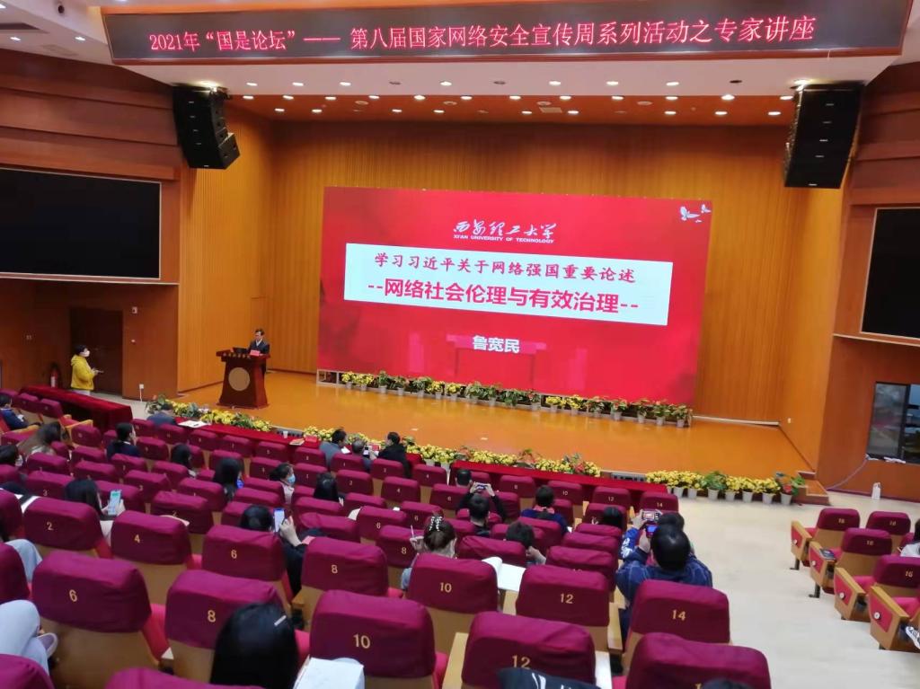 10月27日下午,中共西安培华学院委员会主办、马克思主义学院、党委宣传部承办2021年“国是论坛”第八届国家网络安全宣传周系列活动之专家讲座,邀请西安理工大学鲁宽民教授在西安培华学院图书馆报告厅举行《学习习近平关于网络强国重要论述——网络社会伦理与有效治理》讲座。讲座由校党委宣传部柳雨部长主持,马克思主义学院院长、培华学院党委宣传部及各相关二级学院负责人、骨干教师等100余人参加了会议。