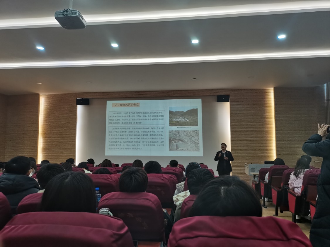 12月8日,我院院长田亮教授在J201教室,为我校历史文化协会社团的学生做《陕甘边根据地的斗争与中国共产党的革命精神》专题报告。这次听取报告的人员以历史文化协会社团学生为主,另外,还有喜欢党史和革命史的部分学生及马院部分老师参加了此次讲座。田亮教授长期从事陕甘边革命根据地史的研究工作,今天他从创建陕甘边革命根据地的斗争、中国共产党的革命精神、陕甘精神是党的革命精神的重要组成部分、陕甘精神与延安精神、与井冈山精神的关系四个方面对陕甘边根据地的发展历史进行了解读。