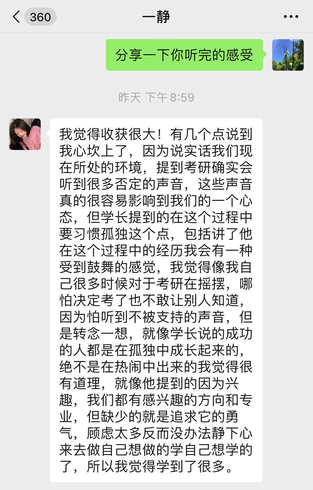 分享会中,庭宇说,翻开厚重的历史书本,近代中国屈辱的外交历程使每个心怀爱国之心的中国人感到依然历历在目,从中学时期他就立志成为一个外交家,为了实现自己的人生理想,大学时期就明确了自己的考研目标:北京外国语大学。因为北外被称为外交官的摇篮,中国的许多著名的外交家毕业于北外。