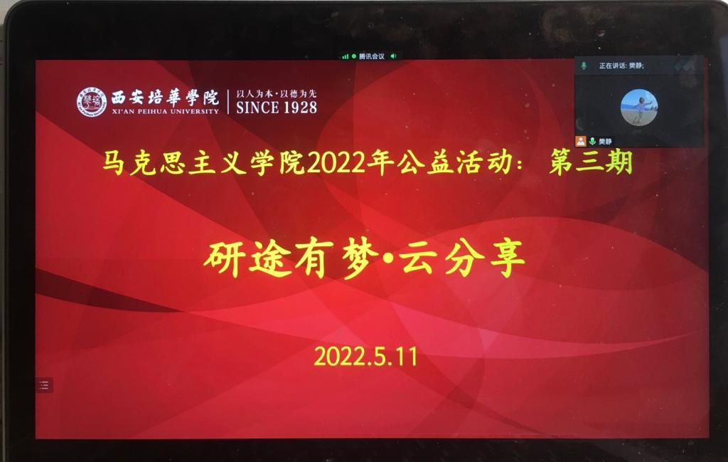 5月11日晚7点20,马院在线上开展了“研”途有梦云分享公益活动第三期。本期考研云分享会邀请到了我校建筑艺术学院工程造价系2018级学生尚庭宇,马院学生社团——青年行研学社、历史与文化协会等60多名师生参与了此次分享会。本次分享会的主题是:背水一战,不留退路才有出路----一战三跨上岸北京外国语大学国际关系与外交学院。