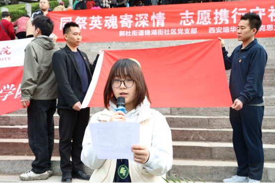 天地英雄气,千秋尚凛然。初春的杨虎城将军烈士陵园内,苍松翠柏,庄严肃穆。上午10时许,祭英烈活动开始,全体人员整齐列队,在杨虎城烈士纪念碑前敬献花篮,肃立静默,共同向革命先烈默哀致敬并郑重地向烈士纪念碑行三鞠躬礼。马克思主义学院党总支书记寇军强结合杨虎城将军生平,现场讲授微党课。他特别强调:“我们不仅是历史的凭吊者,更是使命的传承人。作为新时代青年,要在党史学习中坚定理想信念,在红色基因里厚植家国情怀,将个人成长融入民族复兴的壮阔征程。”