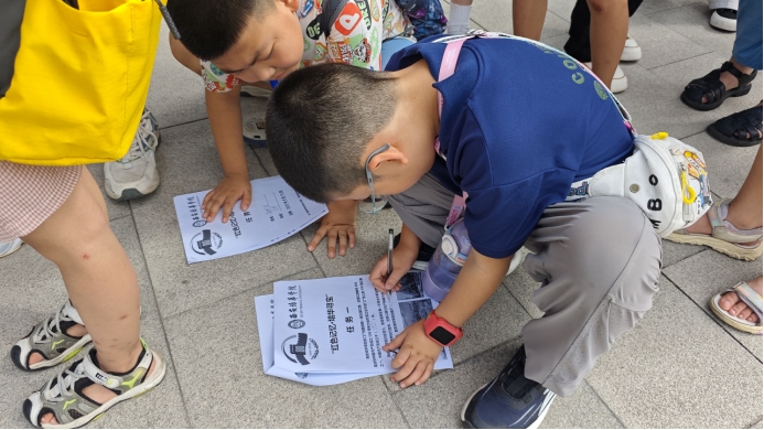“我找到了,我找到了,抗战胜利是在1945年!”8月15日上午,在西安培华学院博远楼《信仰之光》红色文化展厅内,6岁的张永清高高举起手中的寻宝手册,稚嫩而坚定的声音回荡在展厅。1945年8月15日,日本宣布无条件投降。2025年8月15日,一场别开生面的“红色记忆·培华寻宝”主题教育活动在西安培华学院举行,来自莲湖区环城西路街道的20余名小学生在沉浸式体验中完成了一场跨越时空的寻访,也在历史和现实的交汇中,让爱国主义的种子悄然生根发芽。