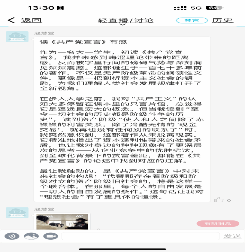 本次读书分享会以课程教学目标为核心,教研室精心遴选《共产党宣言》《马克思传》等经典篇目,提前通过分组领读、云班课活动等方式引导学生做好预习准备。分享现场,来自不同专业的新生代表依次登台,结合自身思考与生活实际分享读书心得:有的同学以“批判与坚守”为关键词,解读《共产党宣言》中蕴含的历史逻辑与时代价值;还有同学将经典理论与当代青年责任相结合,探讨如何用马克思主义立场观点方法应对成长困惑。分享过程中,同学们积极互动答疑,或补充理论背景,或交流阅读方法,思想碰撞间深化了对经典著作的理解。