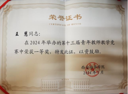 任职期间,主持校级课题4项,参与校级课题9项、省级课题2项。荣获第六届陕西高校青年教师教学竞赛三等奖;西安培华学院第十三届青年教师教学竞赛一等奖;第十八届“挑战杯”全国大学生课外学术科技作品竞赛红色专项活动陕西省赛二等奖、三等奖;“建行杯”第八届中国国际“互联网+”大学生创新创业大赛陕西赛区(“青年红色筑梦之旅”赛道)铜奖;大学生新文科实践大赛中获国赛铜奖一项、优秀奖一项。