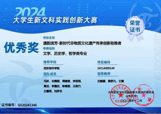 近日,首届全国大学生新文科实践创新大赛落下帷幕。本次大赛共有来自29个省(自治区、直辖市)的17万余名学生报名参赛,参赛项目近2.5万项,我院薛舒凡、沈毓娜、王慧老师指导的《青春践行传薪火 鲜活史料铸基因》项目荣获国赛铜奖;沈毓娜、薛舒凡、王慧老师指导的《遗韵流芳-新时代非物质文化遗产传承创新助推者》项目荣获国赛优秀奖。
