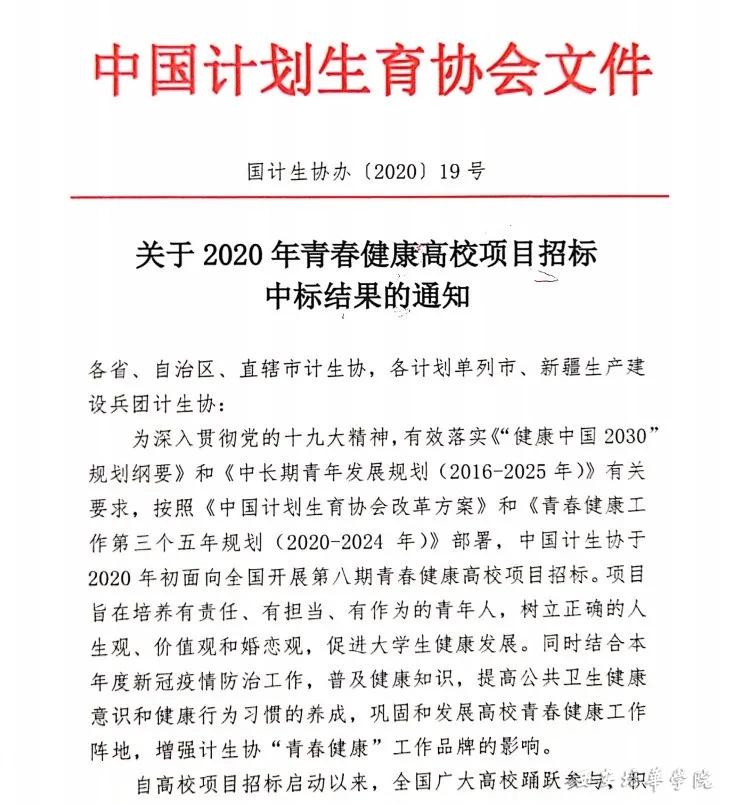 由中国计生协印发的《关于2020年青春健康高校项目招标中标结果的通知》,由我校禁毒防艾社联合青年志愿者联合会共同申报的“青春健康高校项目”,我校以陕西省推荐排序第一名的成绩被中国计生协确立为国家级A类项目,年资助金额1万元,这是我校在这一领域国家级成果的新突破。
