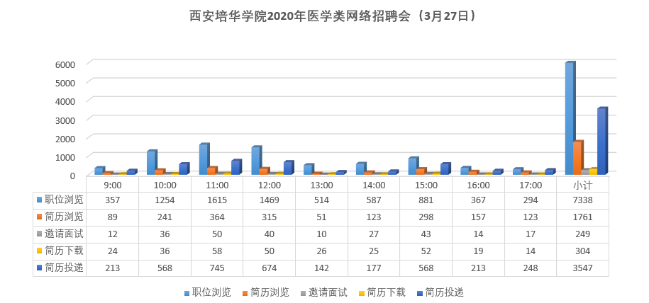 本次网络视频双选会共有符合报名资格的企业60家,其中有上海交通大学医学院附属新华医院崇明分院、西安现代妇产医院、小白兔口腔医疗科技集团股份公司、榆林中大医院、金花企业(集团)股份有限公司西安制药厂等医疗卫生类用人单位。据统计,此次医学类专场招聘会提供职位数1207个,共有1600余名求职者参会,职位浏览7338次,简历投递量达3547次。