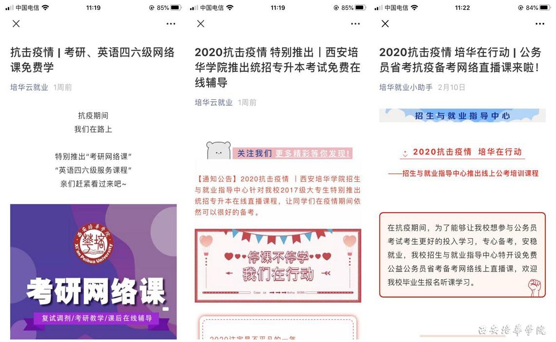 3.精准提供定制服务。依据调研结果,面向有考研升本、四六级、考取公务员等意向的学生,学校定制开设了“抗疫公考”、“考研、四六级”、“专升本”等线上公益培训班,停课不停学。