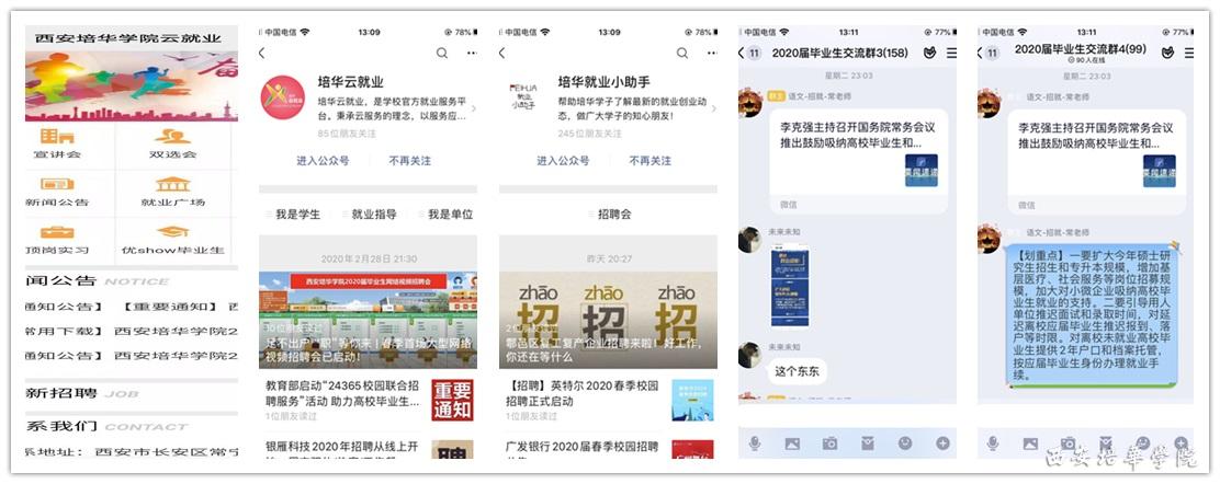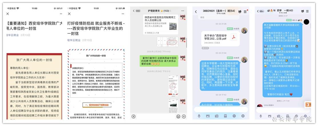 疫情发生后,学校即刻开启“云就业”服务平台,开通“云就业”微信服务号,引进北森“吉讯大学生职业规划测评系统”。通过西安培华学院云就业信息网、“培华云就业”微信服务号、“就业小助手”微信订阅号、就业工作微信群、毕业生QQ\微信群、短信等线上平台,实现就业指导与推荐服务信息“全程化、精准化、高效化”推送。