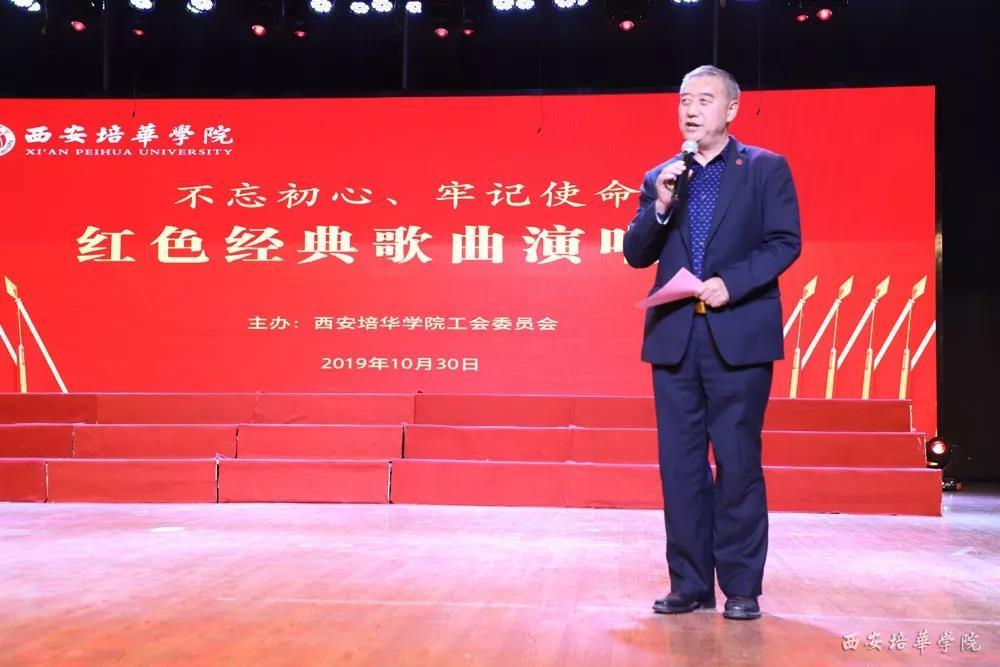10月30日晚,西安培华学院“不忘初心,牢记使命”红色经典歌曲演唱会在大学生活动中心隆重举行,学校理事长姜波、校长李映方、党委书记胡俊生等领导及师生代表500余人观看了这场精彩的红色盛典,晚会现场座无虚席。