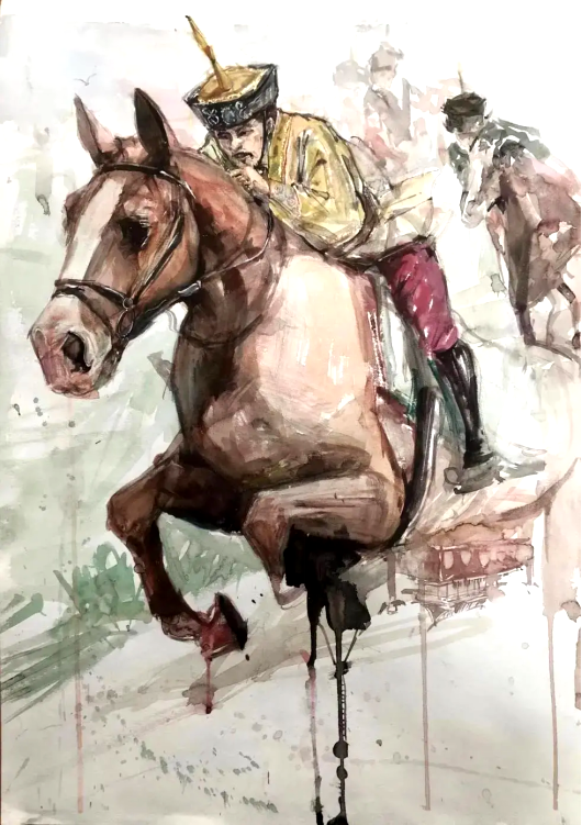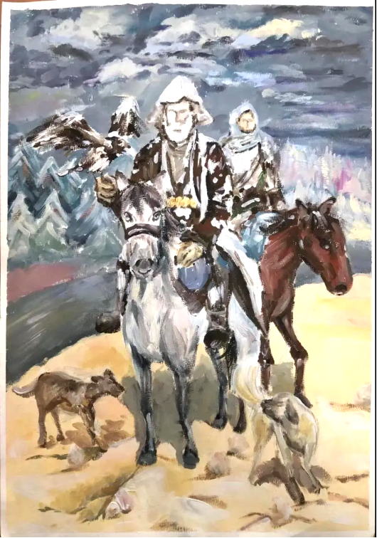 视觉传达专业王婧:我的家乡是美丽的新疆,这幅画是新疆的冬季,草原民族骑马的场景,画面描绘了澄清的高原湖泊、壮丽的雪山雄峰、辽阔的薰衣草地和广袤的戈壁沙漠......构成了一幅美丽的风景,表达了我对家乡的热爱与思念。