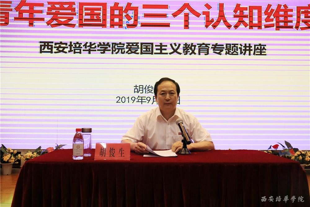 9月27日下午,西安培华学院党委书记胡俊生在维之图书馆报告厅为2019级新生进行爱国主义教育专题讲座,阐述“青年爱国的三个认知维度”。党委宣传部部长柳雨主持讲座,500余名新生聆听讲座。
