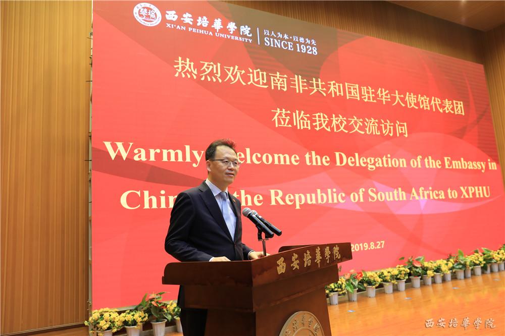 14时,南非驻华大使馆代表团成员与我校400余位学生在图书馆报告厅进行了互动交流。姜波理事长对南非驻华大使馆代表团的到来,表示衷心感谢和热烈欢迎。他回顾了培华九十余年办学历史,着重强调了我校一直以来重视女性教育和女性领导力的提升,坚定围绕“地方性、应用型、国际化”的办学定位建设学校,培养人才。他同时表示,南非是个美丽、富饶的非洲国家,中非一直以来保持着紧密友好的双边关系,希望南非和中国的青年人能够加深了解、互相信任,呼吁在场的学生关注世界、关注南非。