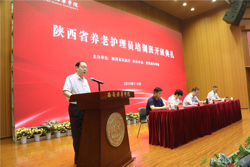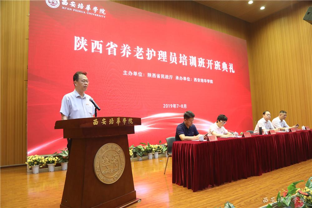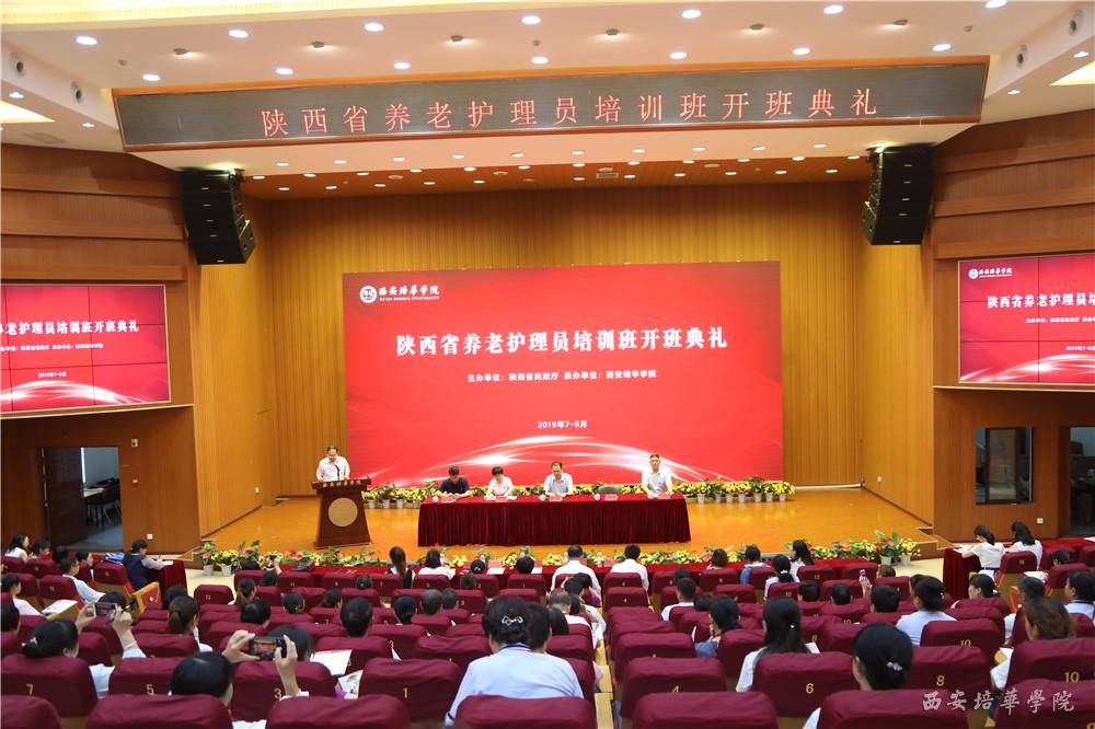 7月9日,由陕西省民政厅主办、西安培华学院承办的陕西省2019年初级养老护理员培训班(第一期)在培华学院维之图书馆报告厅举行开班典礼。陕西省政协常委、致公党陕西省委会副主委、西安培华学院理事长姜波,医学院常务副院长王平安及相关教师,以及来自省内各地市100名从事养老护理服务工作的护理人员参加了典礼。西安培华学院副校长、医学院院长于国亮主持开班典礼。
