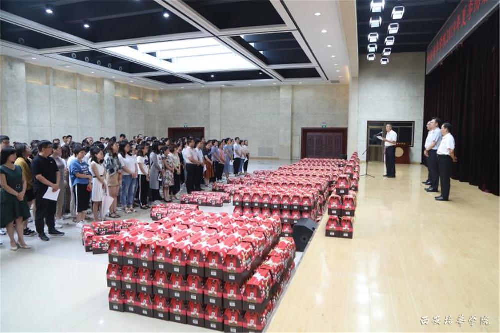 理事长及校领导为教职工代表发放“送清凉”慰问品。