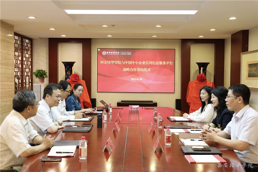 6月28日,西安培华学院与中国中小企业信用信息服务平台战略合作签约仪式在明德楼五楼会议室举行,中国中小企业协会副会长姜海欧,中国中小企业信用管理中心执行主任曹银强,西安培华学院理事长姜波、校长助理秦海锋、会计与金融学院院长赵选民等出席仪式。仪式由西安培华学院会计与金融学院副院长孙文琳主持。
