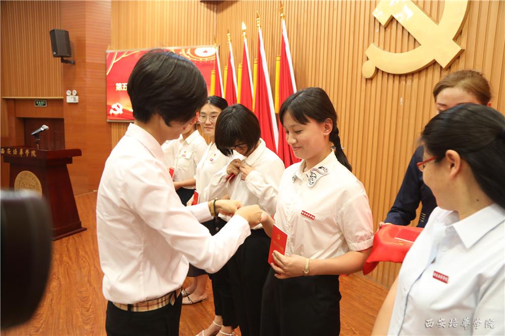 党委副书记、副校长姚文静为新党员代表佩戴党徽、发《党章》。党委书记胡俊生、校长李映方为7月、8月份入党的党员过“政治生日”,送上“生日贺卡”和祝福。