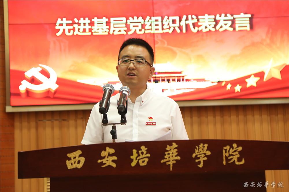 优秀共产党员代表,传媒学院教师杜萍发言,她讲道,在19年的教师党员生涯中,她始终坚持“一棵树影响另一棵树,一朵云推动另一朵云,一个灵魂唤醒另一个灵魂”的教育理念。她表示,此次荣获表彰,离不开党组织的栽培和各位同志的帮助,今后将珍惜荣誉,谦虚谨慎,争取在平凡的岗位上做出更大的成绩。