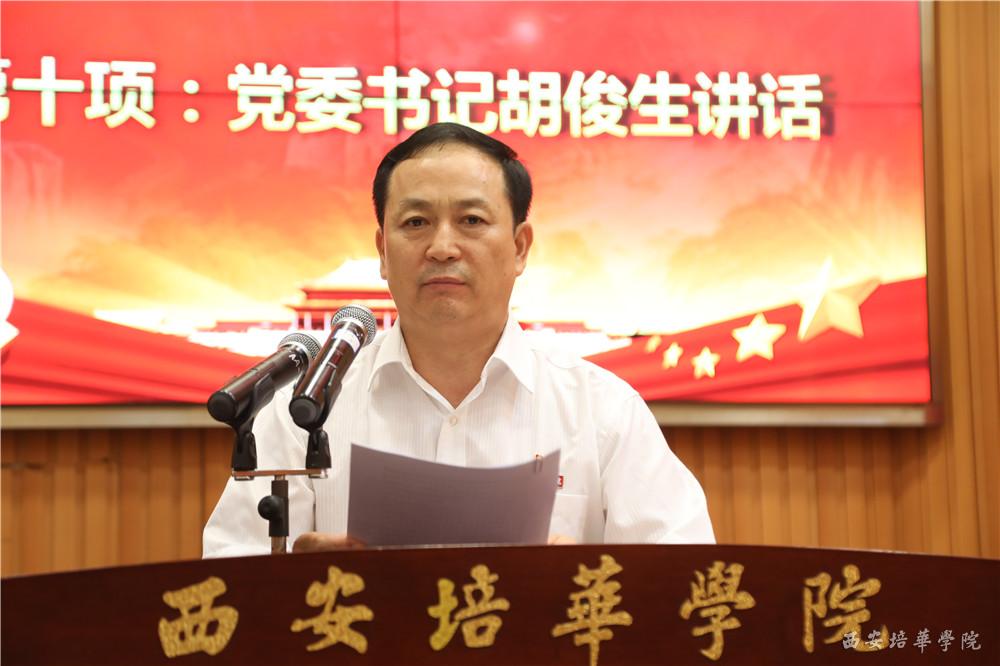 学校党委书记胡俊生在讲话中指出,中国共产党的初心和立党根本,是为广大人民群众谋福利,党员强,则政党强,所以党员同志务必要有强烈的使命感,责任感和危机感,积极作为。他表示,培华的办学史与党的成长史相仿,培华的血脉中蕴藏着强大的红色基因,培华党员同志只有不忘初心,不忘过去,才能开创未来。他强调,党员有力量,培华有未来。希望受表彰的集体和个人,再接再厉,争取更加出色的表现;希望全校师生赶超先进,形成你追我赶的良好风气,在学校理事会的带领下,同心同德干事业,聚精会神谋发展。