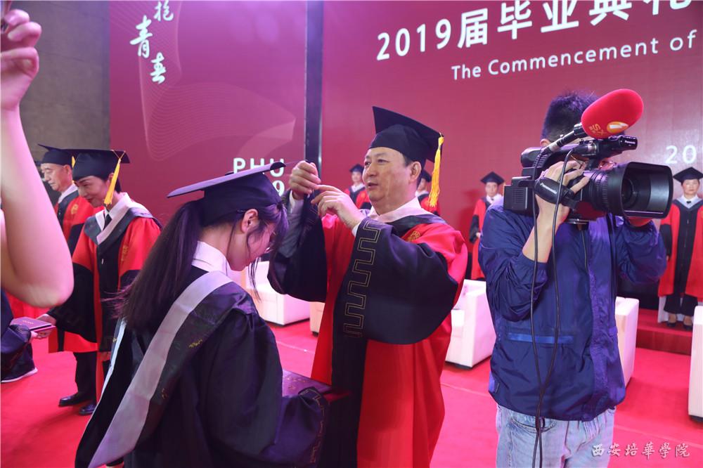 全场瞩目,理事长姜波博士迎来学术权杖;副校长于国亮宣读《西安培华学院关于2019届全日制普通本专科学生毕业(结业)的决定》;学位委员会主席、副校长刘越莲宣读《西安培华学院关于2019届普通高等教育本科毕业生授予学士学位的决定》。