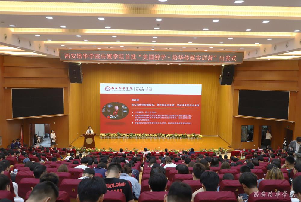 西安培华学院传媒学院首批“美国游学—培华传媒实训营”将于2019年6月24日至7月6日前往美国纽约电影学院洛杉矶分校进行短期访学交流,为鼓励首批美国游学实训营师生,营造热烈良好的学习氛围,进一步推动学院国际化工作,传媒学院于2019年6月20日下午在维之图书馆报告厅举行了西安培华学院传媒学院首批“美国游学-培华传媒实训营”出发式。西安培华学院副校长刘越莲、国际交流中心主任王鹏、传媒学院院长杜耀峰、传媒学院常务副院长王西娅、传媒学院党总支书记江俊瑞、传媒学院副院长赵伟、院长助理张荣花、传媒学院全体教师、实训营团队成员、传媒学院大一、大二全体学生出席和见证此次出发式。